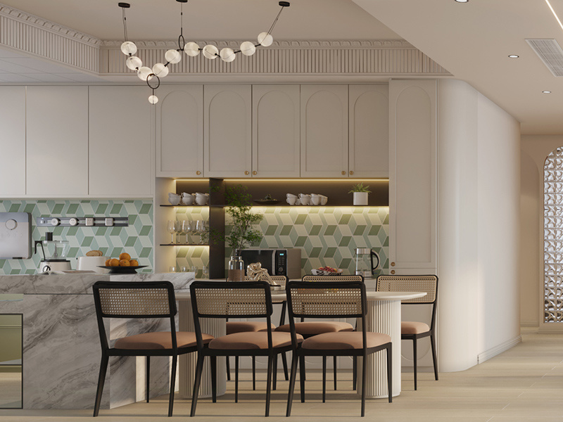 米白橱柜融合藤编餐椅,绿砖点缀提亮,复古球形灯烘托氛围。烹饪用餐时,既具法式复古的烟火浪漫,又借通透布局满足日常烹饪与轻聚需求,是烟火气与优雅感共生的饮食空间。