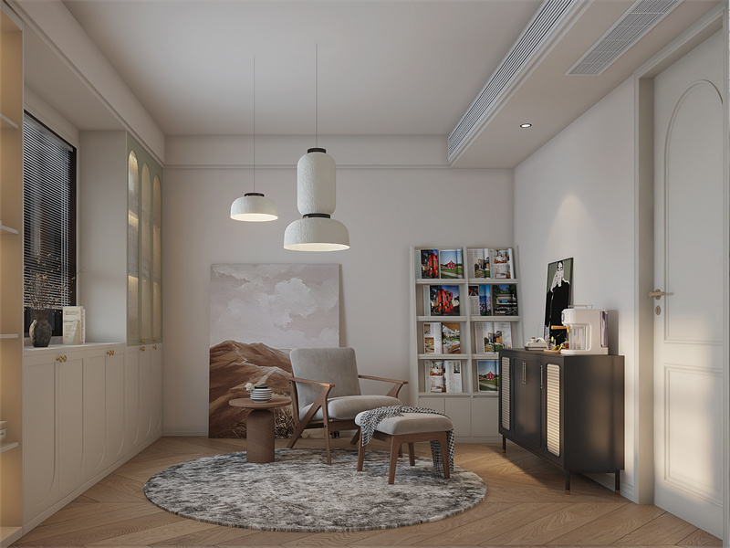 米白墙配木色复古家具,艺术挂画与收纳柜结合,复古吊灯提升格调。日常阅读休闲时,既借复古座椅、艺术摆件营造独处氛围,又因收纳与布局满足轻社交需求,是兼具文化感与复古格调的私域空间,适配阅读、品咖等品质生活场景。