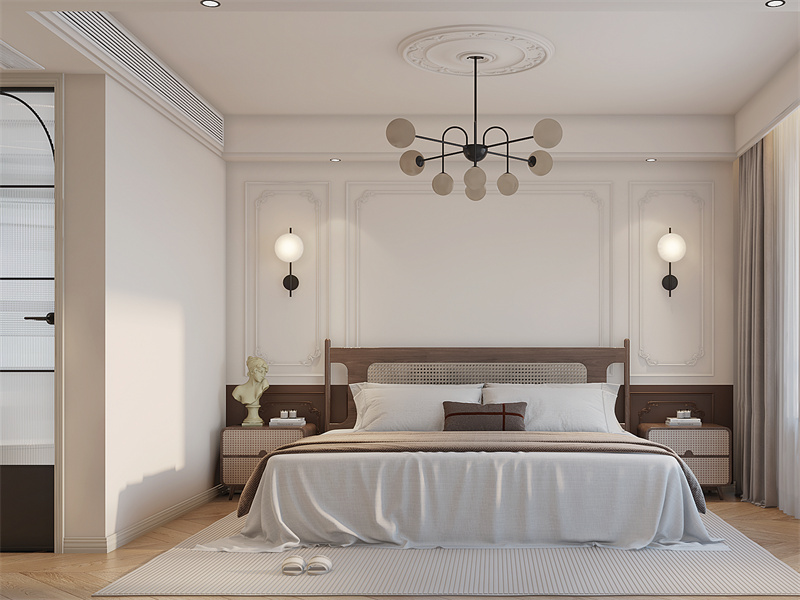 米白与暖棕交织,雕花吊顶、藤编床头搭配复古灯具,雕塑软装注入艺术感。休憩时,复古材质与柔和色彩结合,既满足深度睡眠的私域需求,又借雕花、壁灯打造优雅休憩空间,适配品质睡眠与私域放松。