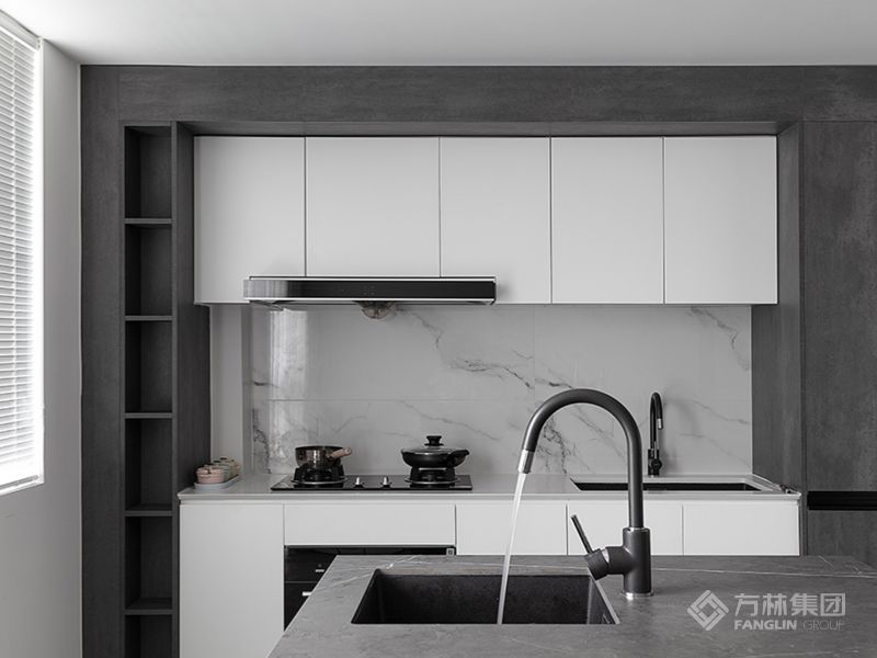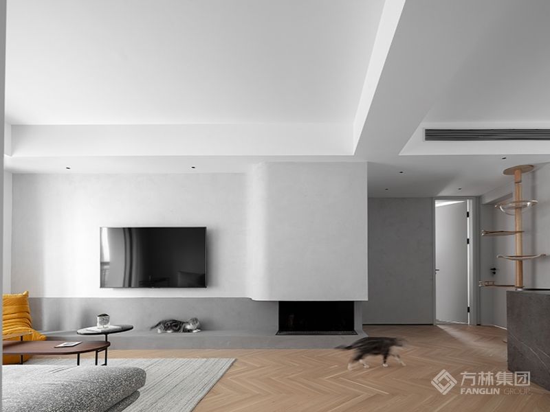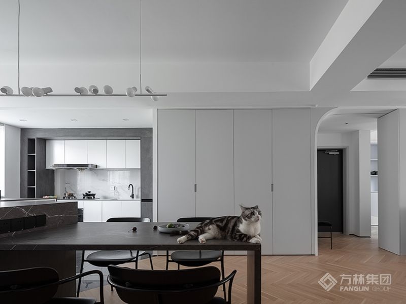 我们将公共区域打开,采用开放布局,让室内各个功能区域之间独立、关联,动线上也更流畅、舒适,增强家人之间的互动交流。弧线元素+灰白的色调,营造舒适、惬意的空间。