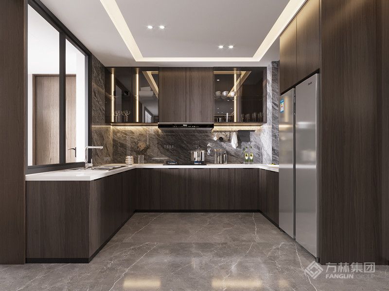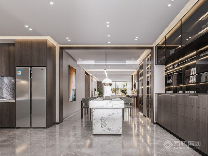 通过户型格局的改造、结合原建筑深长的结构、把客厅——茶室——餐厅——吧台——厨房整合成一个超尺度的大横厅、动线流畅,功能区齐全、令整体空间呈现出奢侈的通透和宽敞。