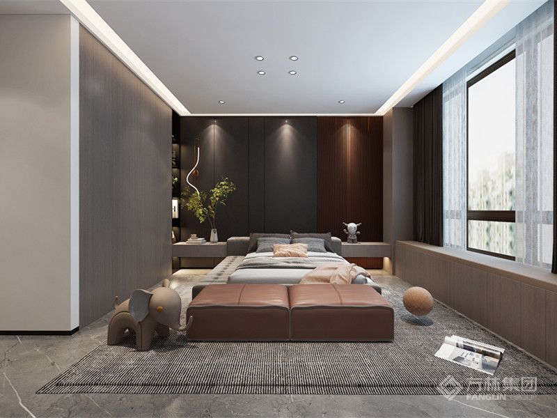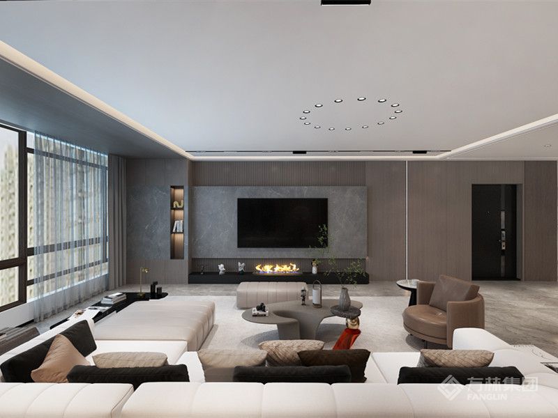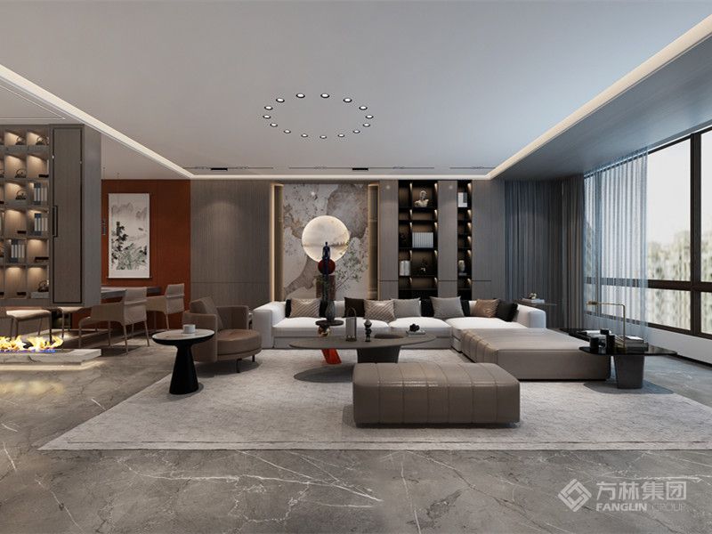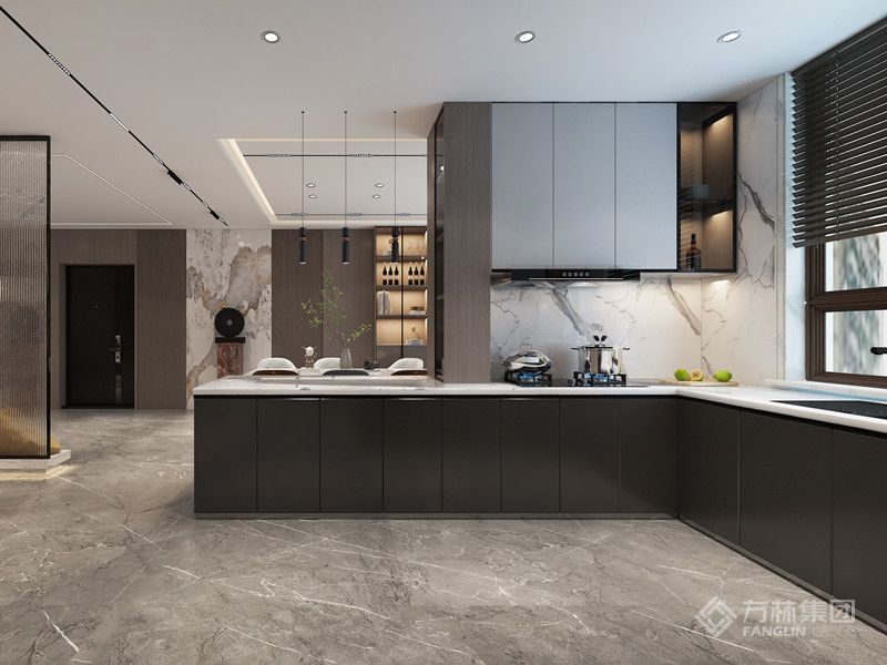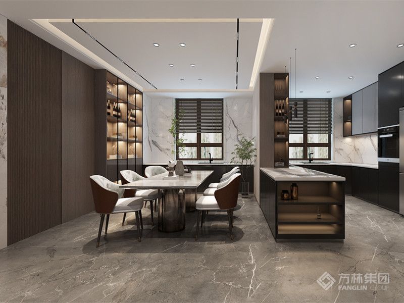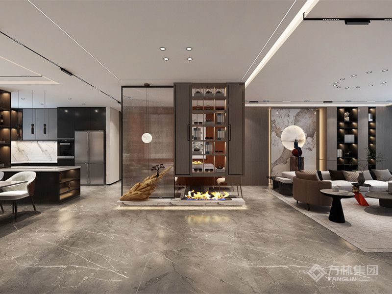 空间在现代简约的基调下,使用暖色壁布配色融合石材材质与木材,在现代简约的同时打造出轻奢风格。大气有格调的整体空间搭配上精致富有美感的装饰